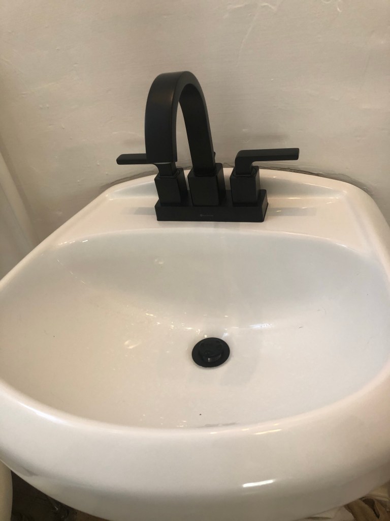 We opted to use excellent This Old House video tutorials to learn how to replace our pedestal sink bowl and then the faucet. We detached the sink from the water and drain pipes, removed the old sink bowl, replaced it with the new sink bowl and attached the new sink faucet. It sounds simple but we had to make sure that none of the valves were going to leak once back in place. Pedestal sinks are hard to work with since they are so close to the wall. We went with a black simple sink faucet to match the black and white them of our new bathroom remodel.