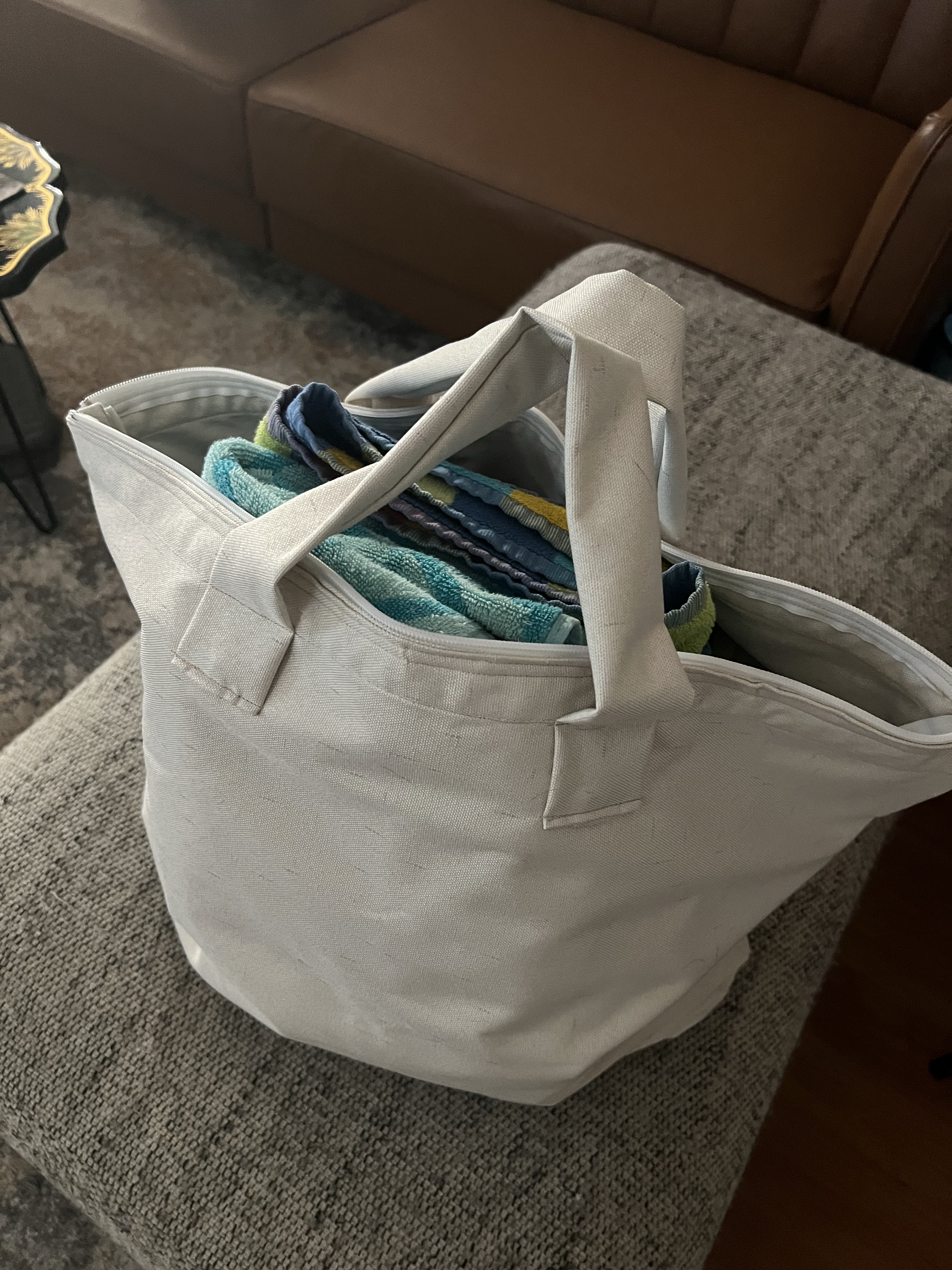 Well the day came that I need another solid carry bag, mostly for Ellie’s items – swim wear bag, sleepover bag, bag for camping. A catch all bag. I re-envisioned these curtains to become a bag. I stitched in a re-purposed zipper I had and absolutely love it! It is large enough to fit two beach towels. One simple trick I tried with this sewing project was to double line the bag so that we have a little more durability in all its multi-use.