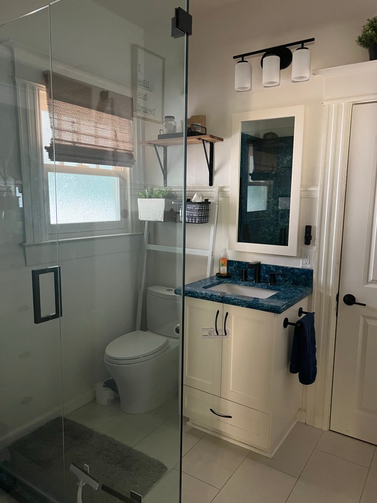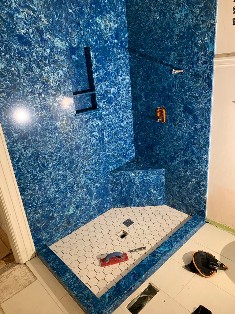 We decided to move our toilet, remove the old tub shower and install a stand up shower. When I first saw the options for a full quartz shower wall, I fell in love with the color skye blue. The continuous rock and design on the color looked and felt like a relaxing waterfall! Take a peak at our beautiful new bathroom 😍
