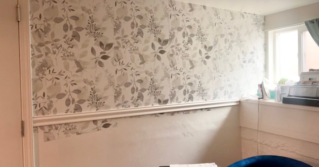 I have to admit, I have never done an accent wall before. So this was way out of my comfort zone! But alas, it was going to be worth it. Surprisingly enough, we started with the wallpaper, which feels like a last step but because I wanted to do a half wallpaper and half bead board wall, I wanted to tackle the wallpaper first (after sanding down the texture) and then put up the half wall of mounding.